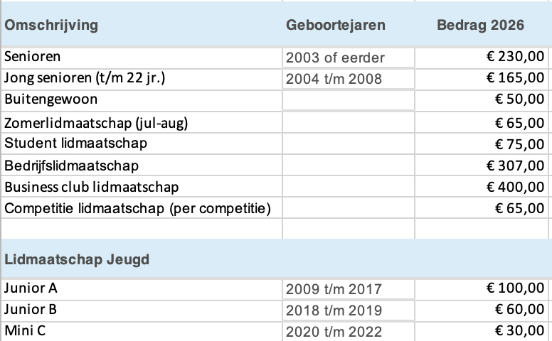 In onderstaand overzicht vind je de contributie voor 2026 per leeftijdscategorie en de tarieven voor trainingen voor de jeugd. Meer informatie over training voor junioren en senioren vind je hier.